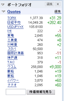 ちょっとうふふですね。昨日はオークションでだいぶ稼げた上、今日はナナオとIHI両方とも日経平均に比べてかなりのパフォーマンス。ばっちし。それに今日は授業もなかったしw